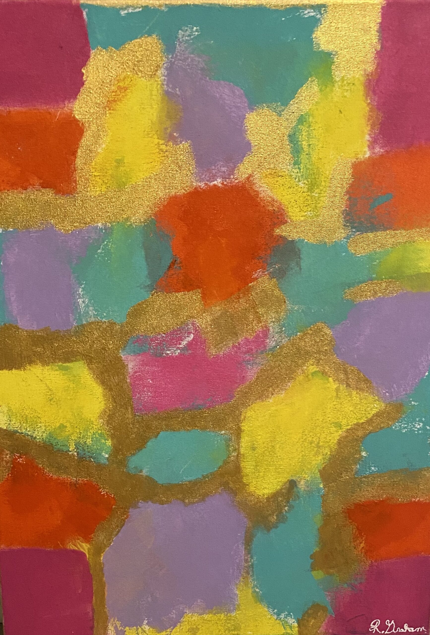 Gilded Conversations is an abstract dialogue of color and texture, where luminous gold threads bind vibrant fields of turquoise, violet, magenta, saffron, and ember red. The composition feels both structured and instinctive—like fragments of thought held together by memory and intuition.